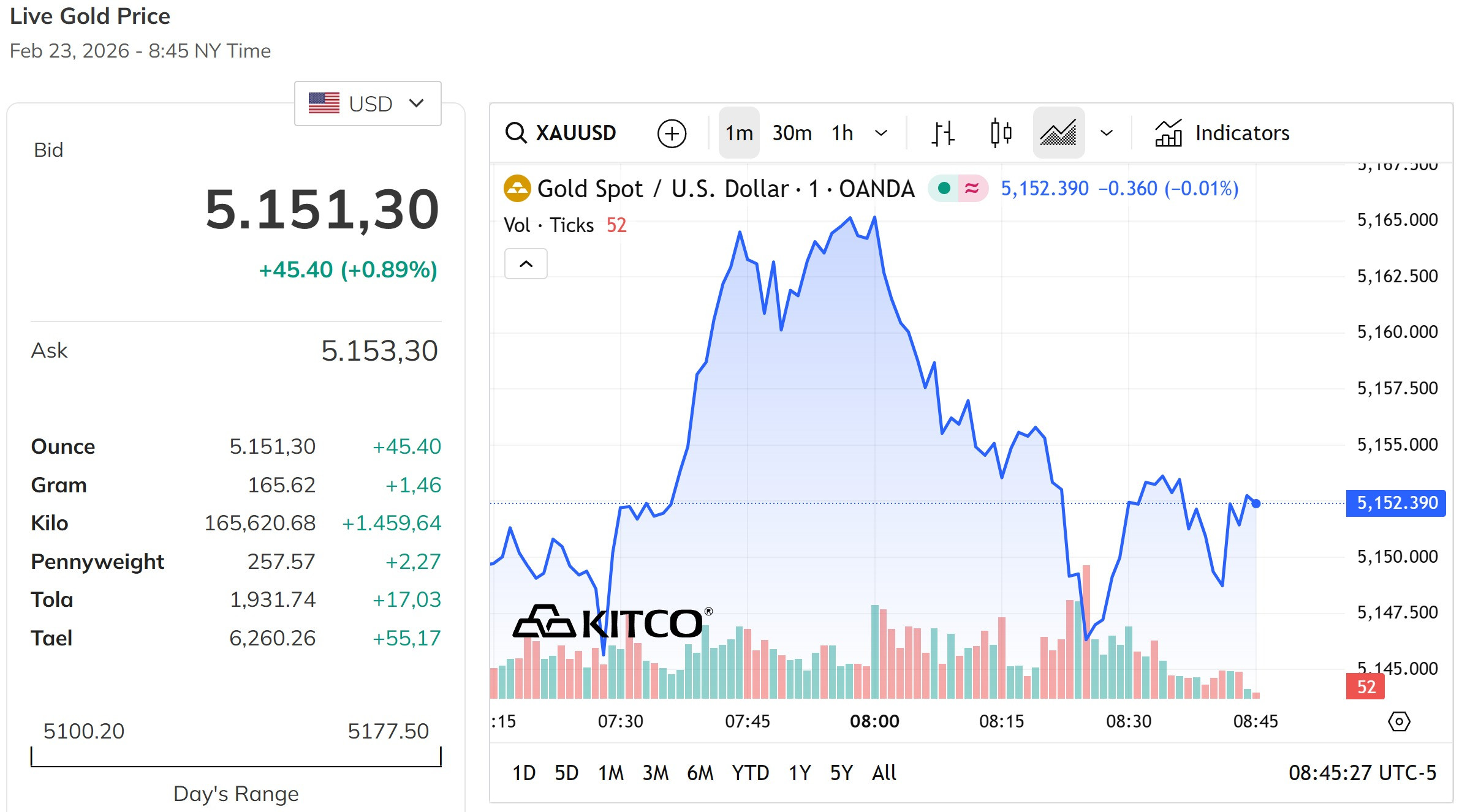 Không chỉ thị trường trong nước, giá vàng trên thị trường quốc tế cũng đang cho thấy một bức tranh tích cực. Bước sang ngày mới 24/02/2026, giá vàng thế giới vẫn duy trì vững chắc trên ngưỡng 5.150 USD/ounce, một tín hiệu đáng mừng cho những ai đang nắm giữ kim loại quý này.