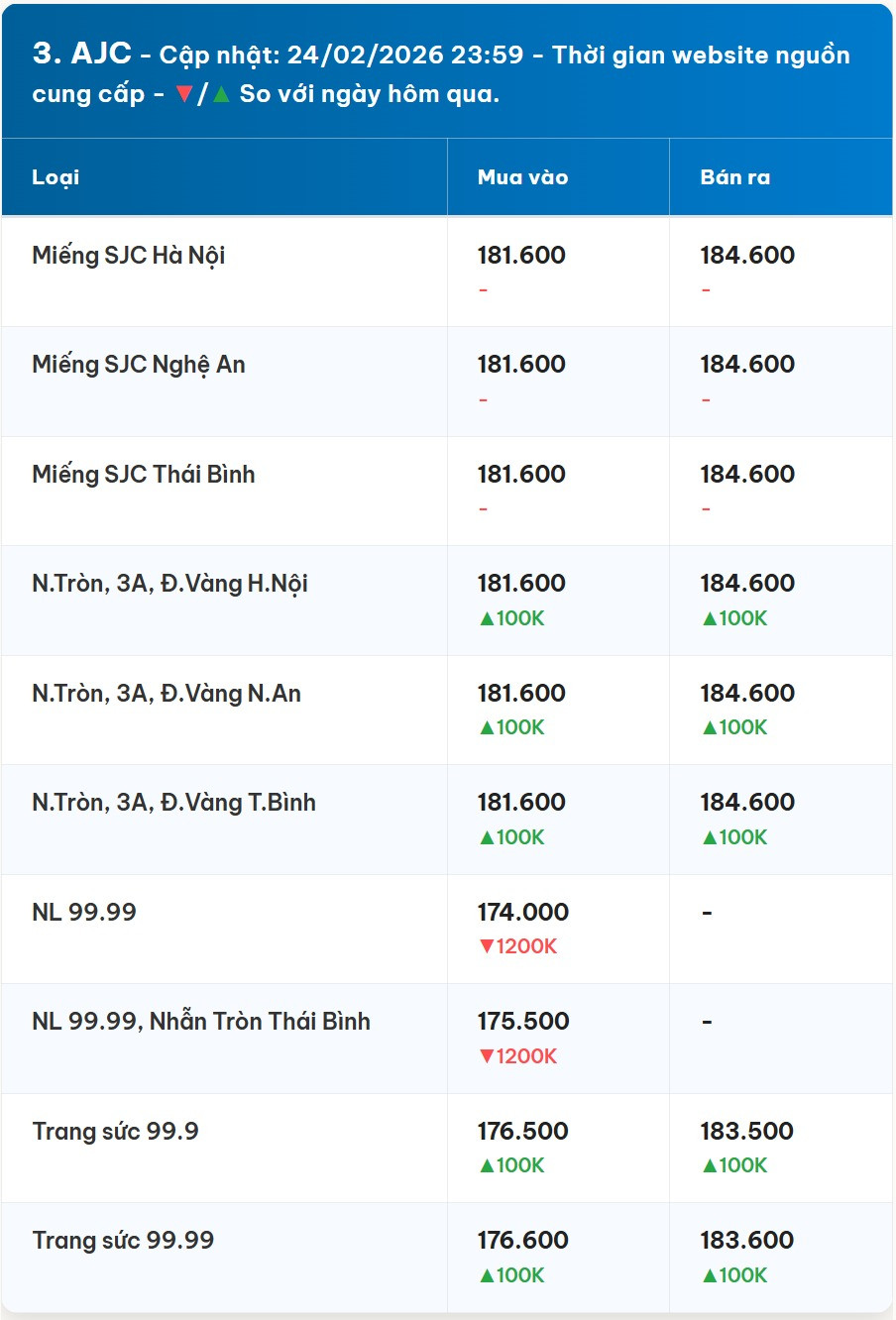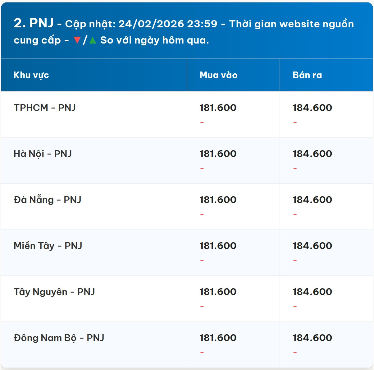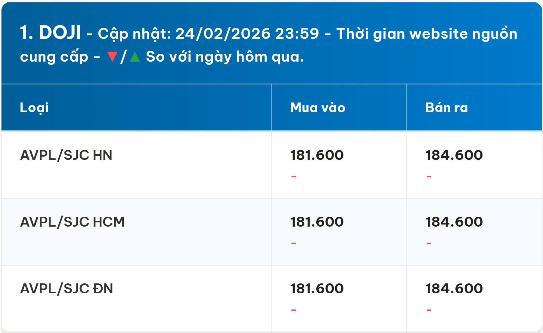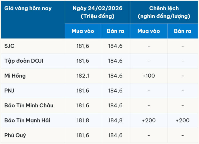 Ở thời điểm 4h00 sáng ngày 25/02/2026, giá vàng SJC mở cửa giao dịch trong khoảng 181,6 – 184,6 triệu đồng/lượng. Đây là một mức giá khá quen thuộc, cho thấy sự kiên định của các doanh nghiệp lớn trong việc neo giữ giá vàng.