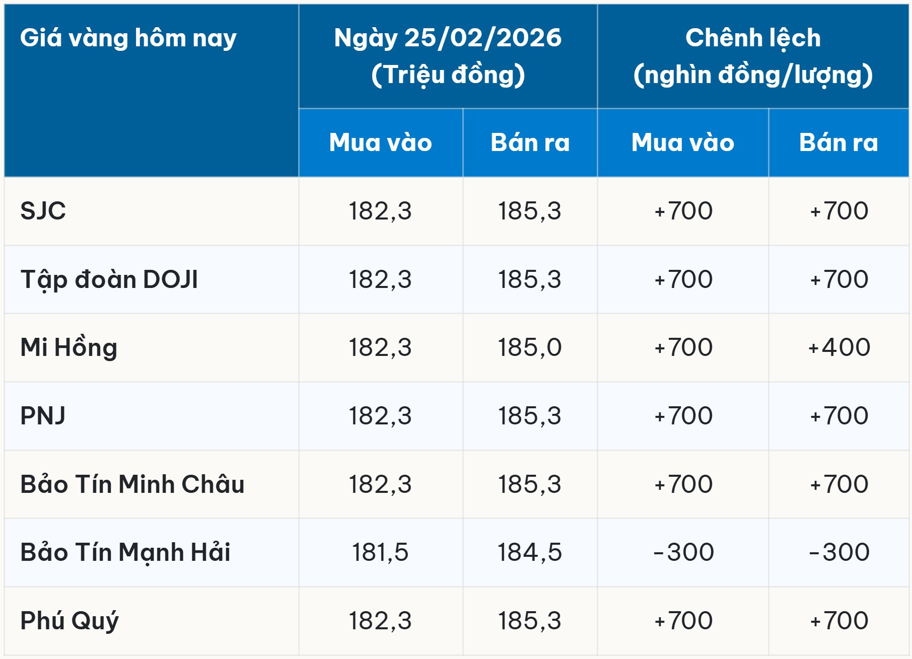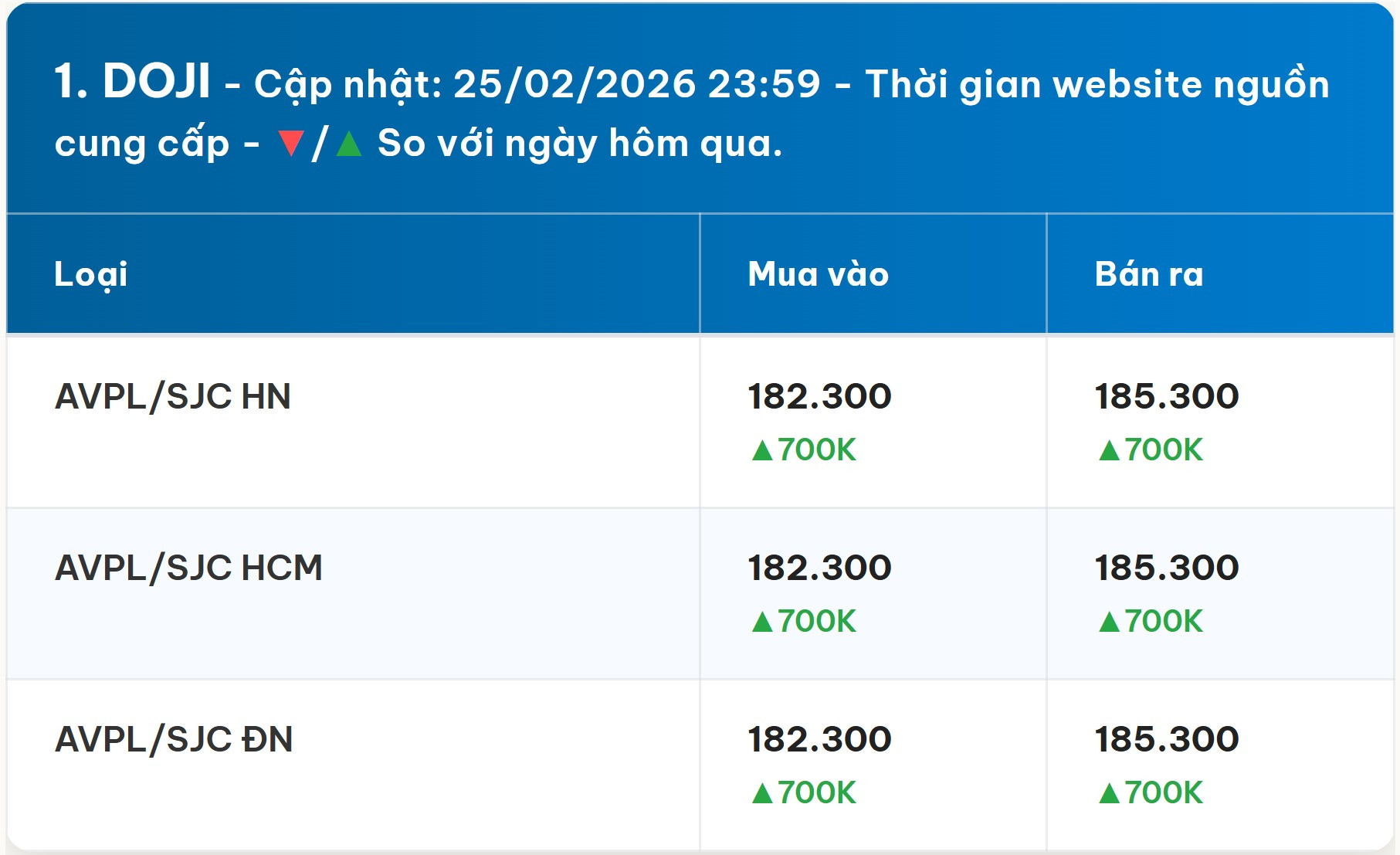 Tại Tập đoàn DOJI, một trong những tên tuổi lớn trên thị trường vàng, giá vàng SJC cũng đã điều chỉnh theo xu hướng chung của thị trường. Doanh nghiệp này niêm yết giá mua vào ở mức 182,3 triệu đồng/lượng và bán ra ở mức 185,3 triệu đồng/lượng. Mức tăng đồng loạt 700 nghìn đồng/lượng ở cả hai chiều mua vào và bán ra là minh chứng rõ nét cho sự tăng nhiệt của thị trường vàng trong ngày vía Thần Tài. Việc niêm yết giá một cách minh bạch và kịp thời như DOJI giúp người tiêu dùng dễ dàng theo dõi và đưa ra quyết định giao dịch.