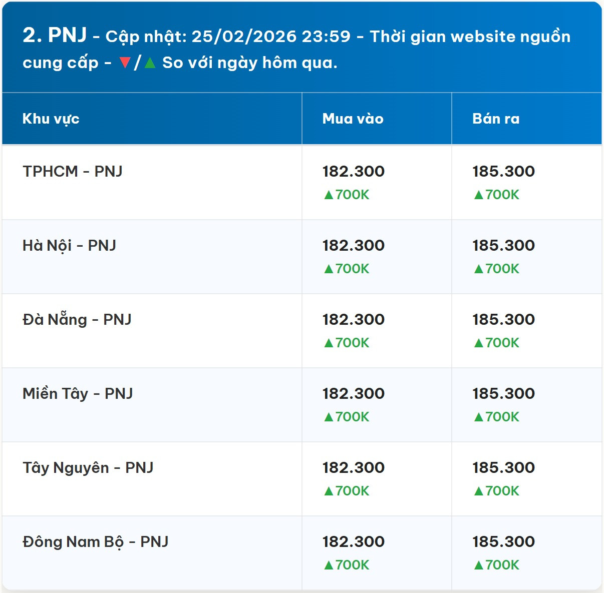 Công ty Cổ phần Vàng Bạc Đá Quý Phú Nhuận (PNJ) cũng cho thấy một bức tranh thị trường tương đồng với các doanh nghiệp lớn khác. Sáng ngày 25/02, giá mua vào được điều chỉnh lên 182,3 triệu đồng/lượng, trong khi giá bán ra giữ ở mức 185,3 triệu đồng/lượng. Trước đó, trong phiên giao dịch ngày 24/02, cả hai chiều mua và bán đều ghi nhận mức tăng 700 nghìn đồng/lượng. Điều này cho thấy PNJ đang theo sát diễn biến thị trường và có những động thái điều chỉnh giá phù hợp để thu hút khách hàng, đồng thời duy trì lợi nhuận. Sự uy tín của PNJ cũng góp phần tạo nên sức hút đối với các nhà đầu tư.