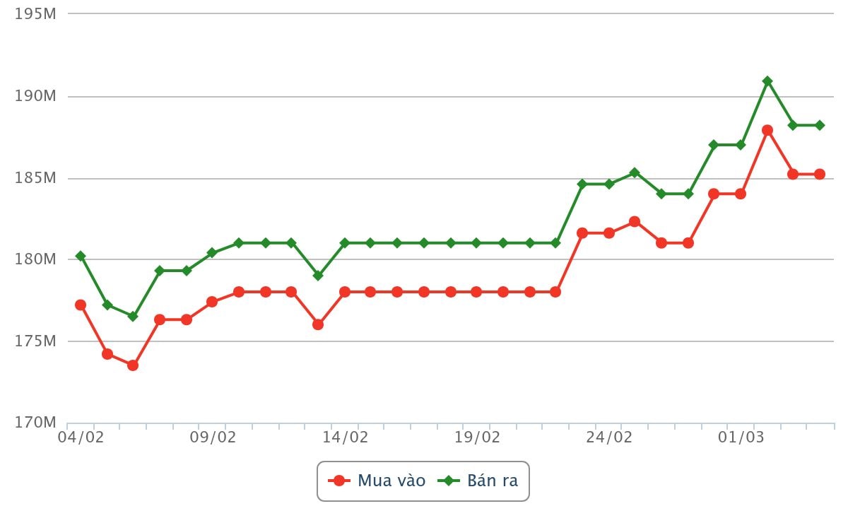 Bảo Tín Minh Châu (BTMC) cho thấy giá vàng ngày 4/3 lúc 4h30 neo ở vùng 185,2 triệu đồng/lượng (mua vào) và 188,2 triệu đồng/lượng (bán ra). Sau khi ghi nhận giảm 2,7 triệu đồng/lượng ở cả hai chiều trong phiên trước, đà giảm dường như đã tạm thời chững lại.