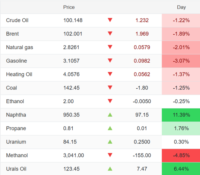 Không chỉ có dầu thô, các sản phẩm năng lượng khác cũng cho thấy sự phân hóa rõ rệt. Xăng (Gasoline) ghi nhận mức giảm 3,07%, dầu sưởi (Heating Oil) giảm 1,37%, và Methanol cũng giảm mạnh tới 4,85%. Ngược lại, khí tự nhiên (Natural Gas) giảm 2,01%, than đá (Coal) giảm 1,25%. Tuy nhiên, Propane lại có mức tăng nhẹ 1,76%, còn Uranium tăng 0,30%. Sự biến động đa chiều này cho thấy các yếu tố cung cầu và ảnh hưởng từ các sự kiện kinh tế, chính trị đang tác động khác nhau đến từng loại năng lượng cụ thể.