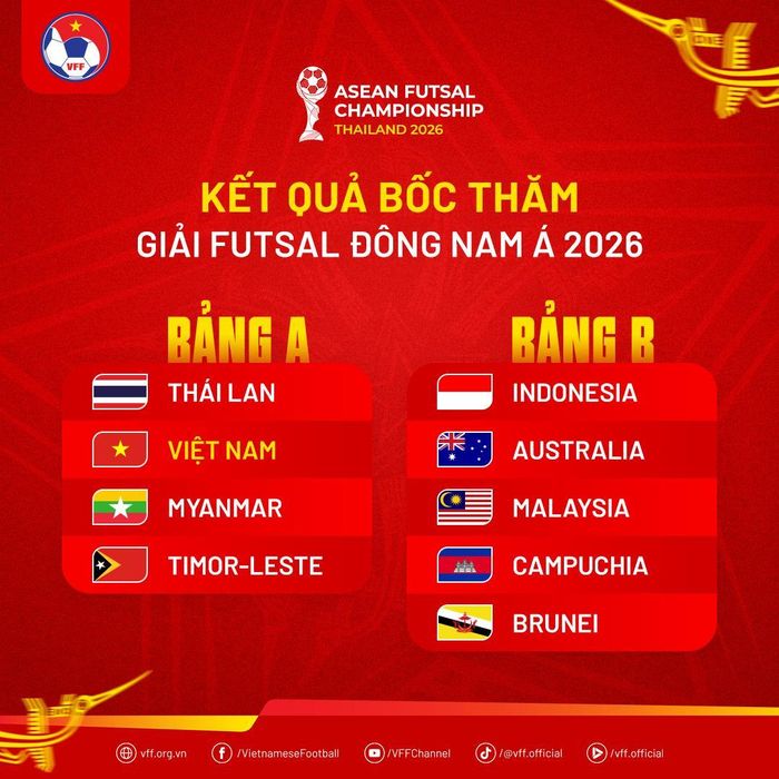 Kết quả bốc thăm đã đưa đội tuyển futsal Việt Nam của chúng ta vào bảng A, một bảng đấu được đánh giá là vô cùng “nảy lửa”. Nằm cùng bảng với các chiến binh sao vàng không ai khác chính là chủ nhà Thái Lan, đội bóng giàu truyền thống và thành tích nhất nhì Đông Nam Á. Bên cạnh đó, chúng ta còn phải đối mặt với Myanmar – một đối thủ có lối chơi rất khó chịu, mạnh mẽ và luôn thi đấu đầy quyết tâm. Không dừng lại ở đó, Timor-Leste cũng sẽ góp mặt, tạo nên một bảng đấu đầy kịch tính và không khoan nhượng.
