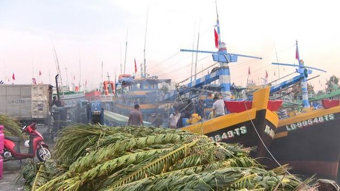 Để đảm bảo cho những chuyến đi biển kéo dài nhiều ngày, việc chuẩn bị vật tư là vô cùng quan trọng. Trên các boong tàu, những khối đá chẻ trắng tinh được xếp chồng lên nhau, sẵn sàng cho nhiệm vụ bảo quản hải sản sau khi đánh bắt. Bên cạnh đó, những bó tàu dừa được kết lại thành mành chà cũng được tập kết gọn gàng. Đây là những vật liệu quen thuộc, được bà con ngư dân sử dụng để tạo ra các “bãi chà” nhân tạo dưới đáy biển, nơi thu hút nhiều loại cá, tôm và các sinh vật biển khác, giúp tăng hiệu quả đánh bắt.