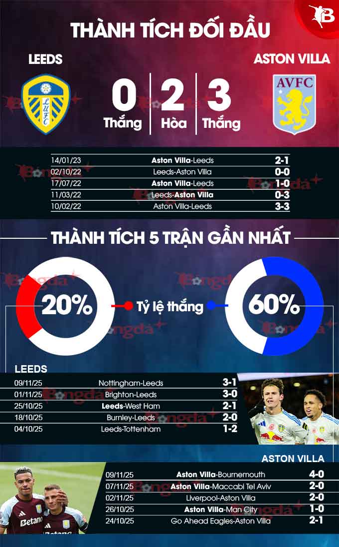 Thống kê cho thấy Leeds United không thắng trong 5 lần gần nhất chạm trán Aston Villa tại Premier League. Lịch sử đang chống lại họ, nhưng bóng đá luôn chứa đựng những bất ngờ. Biết đâu, một chiến thắng sẽ là cú hích lớn cho Leeds?