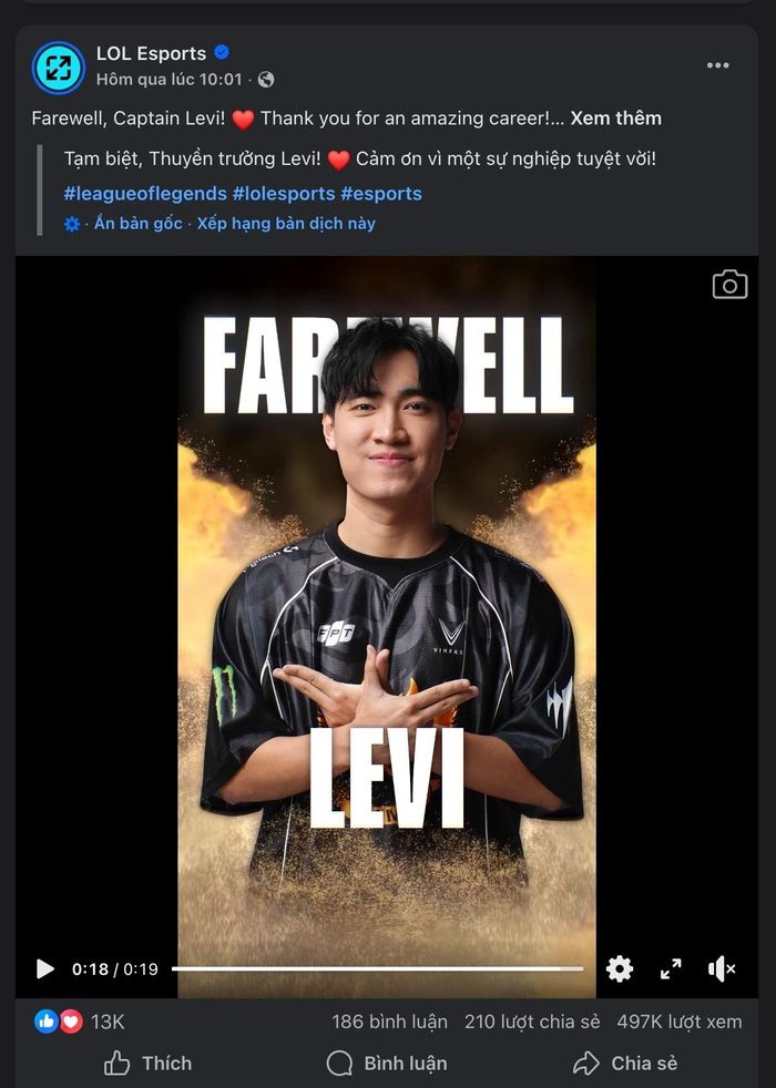 Mới đây, LOL Esports đã đăng tải một đoạn video vinh danh Levi, thể hiện sự công nhận đối với những đóng góp to lớn của anh cho Liên Minh Huyền Thoại. Đoạn video này đã nhận được sự hưởng ứng nhiệt tình từ cộng đồng game thủ trên toàn thế giới, cho thấy tầm ảnh hưởng và sức hút của Levi đối với người hâm mộ.