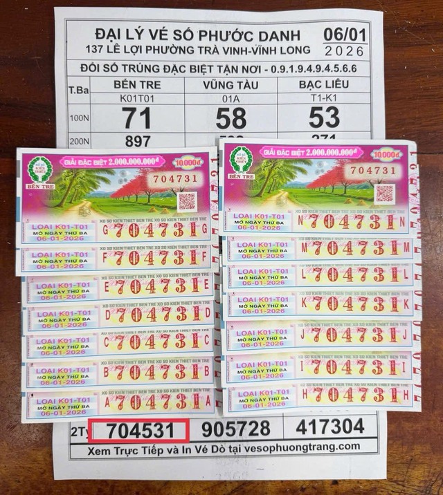 Không chỉ có đại lý Phước Danh, một đại lý khác tại Vĩnh Long là đại lý Duy cũng vừa trao thưởng cho khách hàng trúng 14 giải tư của đài Cà Mau mở thưởng ngày 5 tháng 1. Các tờ vé số trúng giải có 5 số cuối là 67897.