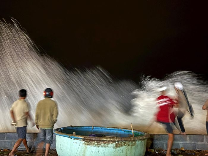 Đêm 27/11, khu phố Hàm Tiến 1 (phường Mũi Né, Lâm Đồng) chứng kiến những đợt sóng cao từ 4-5 mét hung hãn tấn công vào bờ. Chỉ trong vài giờ, hơn chục hàng quán và cơ sở kinh doanh du lịch sát biển phải vội vàng di dời tài sản, tìm nơi trú ẩn an toàn. Cảnh tượng hỗn loạn và bất lực bao trùm cả khu vực khi chứng kiến “thủy quái” hung hăng gặm nhấm bờ biển.