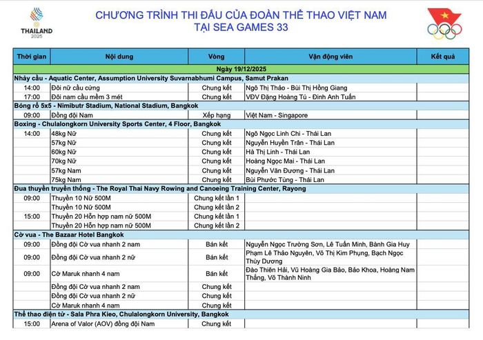 Ngày thi đấu 19/12 tại SEA Games 33 được kỳ vọng là một ngày bội thu huy chương vàng cho Đoàn Thể thao Việt Nam, đặc biệt ở bộ môn boxing. Với 6 võ sĩ lọt vào chung kết, đây được xem là cơ hội lớn để chúng ta gia tăng đáng kể số lượng huy chương vàng, củng cố vị thế trên bảng tổng sắp.