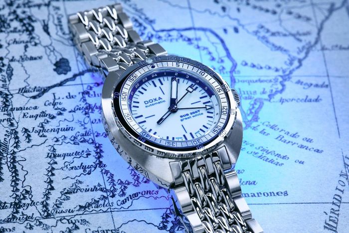 Doxa SUB 250T GMT ‘Great White’ Topper Edition là một chiếc đồng hồ lặn với thiết kế trắng toàn phần độc đáo. Chức năng GMT cho phép người dùng dễ dàng theo dõi thời gian ở hai múi giờ khác nhau. Các chi tiết màu xanh được làm nổi bật trên nền trắng, giúp phân biệt hai múi giờ một cách trực quan. Với mức giá 2.990 USD và số lượng giới hạn 100 chiếc, đây là một chiếc đồng hồ lặn vừa đẹp, vừa chất lượng.