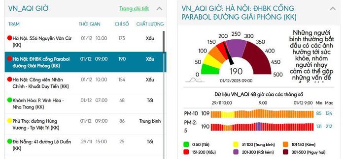 Những ngày đầu tháng 12, Hà Nội chìm trong lớp sương mù ô nhiễm. Các trạm quan trắc không khí liên tục ghi nhận chỉ số AQI (chỉ số chất lượng không khí) ở mức cao, thậm chí vượt ngưỡng nguy hiểm. Cụ thể, vào sáng ngày 1/12, tại một số điểm đo như 556 Nguyễn Văn Cừ, Đại học Bách Khoa, Công viên Nhân Chính – Khuất Duy Tiến, chỉ số AQI dao động từ 144 đến 192, tương ứng với mức “kém” và “xấu”.