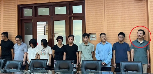 Shark Bình và đồng phạm trong vụ án liên quan đến các vi phạm xảy ra tại Công ty Cổ phần Tập đoàn NextTech (ông Đào Minh Phú ngoài cùng bên phải). Ảnh: CAHN