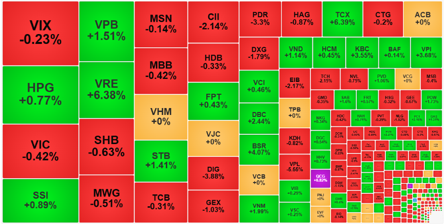 Trong nhóm cổ phiếu vốn hóa lớn, VPB, HPG, FPT là những cái tên đáng chú ý với sắc xanh. Ngược lại, nhiều cổ phiếu khác lại đang “đỏ mặt”. Điều này cho thấy sự phân hóa rõ rệt trong nhóm cổ phiếu trụ.