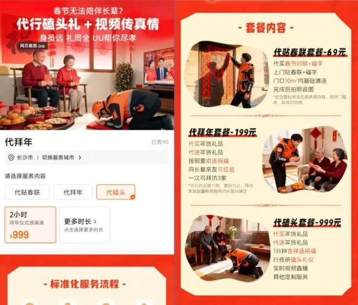 Công ty UU Paotui, một công ty giao hàng có trụ sở tại Hà Nam, Trung Quốc, đã tung ra các gói dịch vụ đặc biệt dành riêng cho dịp Tết Nguyên Đán, nhắm đến những người con xa quê không thể trực tiếp về nhà sum họp. Các gói dịch vụ này bao gồm từ những việc đơn giản như mua và treo câu đối, dán chữ “Phúc”, lau dọn cửa ra vào (gói cơ bản 39 NDT/giờ) đến việc mua quà, đọc lời chúc và nhận lì xì từ người lớn tuổi (gói 199 NDT/2 giờ). Điều đáng nói là gói dịch vụ cao cấp nhất, trị giá 999 NDT/2 giờ, bao gồm cả nghi thức quỳ lạy truyền thống trước người lớn tuổi, và được phát trực tiếp để khách hàng theo dõi từ xa. Chi phí đi lại, quà tặng do khách hàng chi trả.