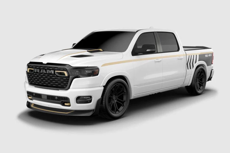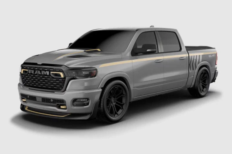 Để tăng thêm sự sang trọng và cá tính, Ram 1500 Lowered 2026 được trang bị các đường viền vàng chạy dọc thân xe, từ lưới tản nhiệt, nắp capo cho đến hai bên hông. Chi tiết này không chỉ tạo điểm nhấn thị giác mà còn thể hiện sự tỉ mỉ và tinh tế trong thiết kế. Sự kết hợp giữa màu sắc mạnh mẽ và đường viền vàng sang trọng tạo nên một phong cách độc đáo, không lẫn vào đâu được.