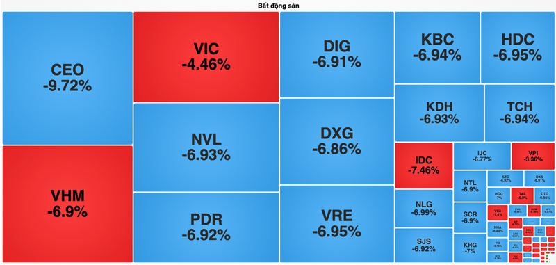 Phiên giao dịch ngày 20/10 chứng kiến hàng loạt cổ phiếu thuộc các nhóm ngành ngân hàng, bất động sản, bán lẻ “lau sàn” (giảm hết biên độ). Các “ông lớn” như Techcombank (TCB), VPBank (VPB), Masan (MSN), Hòa Phát (HPG) đều chịu áp lực bán mạnh, khiến giá cổ phiếu giảm sâu. Sự sụt giảm của các cổ phiếu trụ cột này đã tác động tiêu cực đến toàn thị trường.