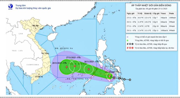 Trong khoảng chiều ngày 26 đến ngày 28-11, khu vực giữa Biển Đông và vùng biển phía Bắc khu vực Nam Biển Đông (bao gồm vùng biển phía Bắc đặc khu Trường Sa) có khả năng chịu tác động của gió mạnh cấp 10-11, giật cấp 14. Đây là một nguy cơ rất lớn đối với tàu thuyền và các hoạt động trên biển.