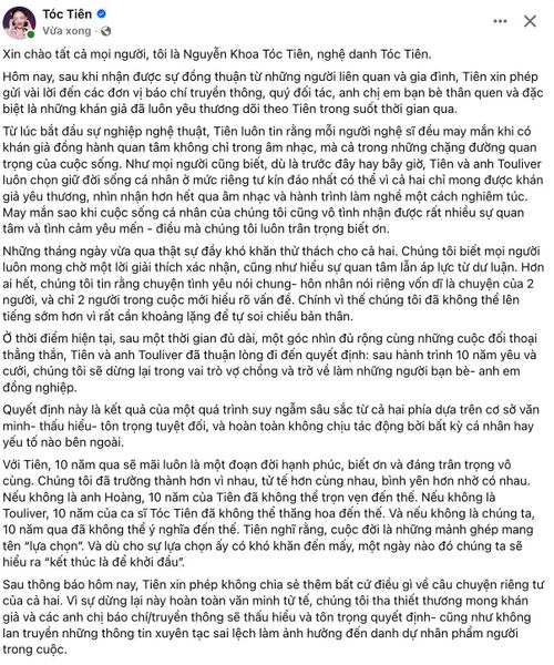 Tóc Tiên và Touliver từng được xem là một cặp đôi đẹp của showbiz Việt, sự kết hợp giữa giọng ca cá tính và nhà sản xuất âm nhạc tài ba. Quyết định kết thúc mối quan hệ này chắc chắn là một điều khó khăn đối với cả hai. Tuy nhiên, những lời động viên từ bạn bè và người hâm mộ sẽ giúp Tóc Tiên thêm vững bước trên con đường phía trước.