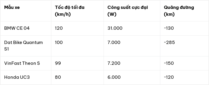 Khám phá top xe máy điện nhanh nhất Việt Nam! So sánh tốc độ, quãng đường di chuyển, công nghệ và giá cả của BMW CE 04, Dat Bike Quantum S1, VinFast Theon S, Honda UC3.