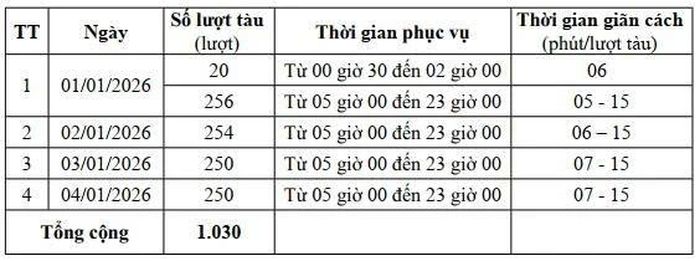 Để đáp ứng nhu cầu di chuyển tăng cao của người dân trong dịp Tết Dương lịch, đặc biệt là vào đêm giao thừa, tuyến đường sắt đô thị số 1 sẽ tăng cường số lượt tàu. Theo kế hoạch, metro sẽ tăng thêm 52 lượt tàu so với ngày trước đó, đảm bảo người dân có thể dễ dàng di chuyển đến các địa điểm vui chơi, xem pháo hoa và tham gia các hoạt động chào đón năm mới.