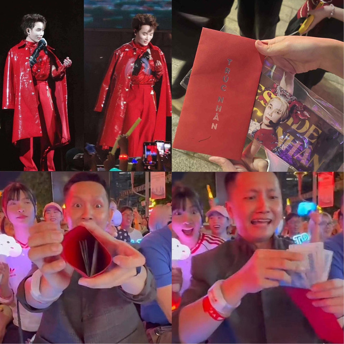 Tối hôm đó, không khí tại đêm diễn thật sự bùng nổ! Ánh đèn rực rỡ, âm nhạc sôi động, và rồi… Trúc Nhân xuất hiện với bộ trang phục đỏ chói, tay cầm những phong bao lì xì đỏ thắm. Khoảnh khắc đó, cả sân khấu như vỡ òa! Ai mà ngờ được, Trúc Nhân lại có thể “chơi lớn” đến vậy, mang đến một bất ngờ có một không hai cho những người hâm mộ của mình.