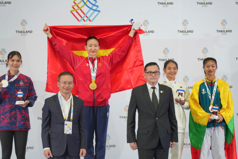 Thêm một VĐV Karate nữa tỏa sáng! Đinh Thị Hương đã giành HCV ở hạng cân 68kg nữ. Cô đã có những pha ra đòn chính xác và hiệu quả, khiến đối thủ phải khuất phục.