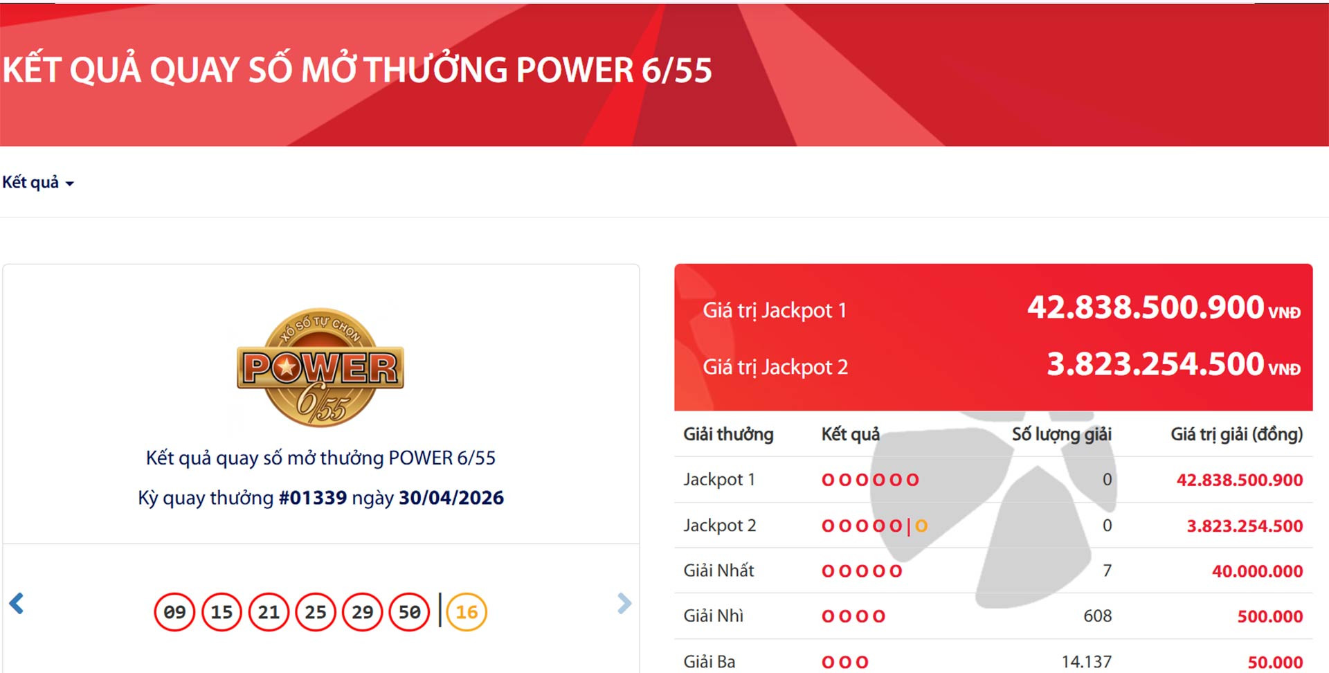 Dãy số may mắn của kỳ quay số mở thưởng (QSMT) lần thứ 1.339 là: 09 – 15 – 21 – 25 – 29 – 50. Cặp số vàng dùng để xác định chủ nhân giải Jackpot 2 là 16. Theo ghi nhận từ hệ thống, cả hai giải thưởng lớn nhất là Jackpot 1 và Jackpot 2 đều không tìm thấy người trúng giải.