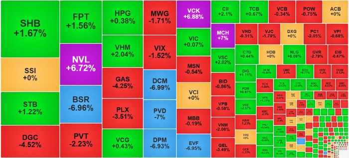 Trong nhóm bất động sản, VHM tăng 2,04%, NVL tăng 6,72%, CII tăng 2,1%, NLG tăng 6,06%, DIG tăng 1,11%. Tuy nhiên, số lượng cổ phiếu bất động sản giảm giá cũng không hề ít. Tương tự, trong nhóm chứng khoán, VCK tăng kịch trần, VPX tăng 1,31%, TCX tăng 2,53%, nhưng cũng có hàng chục mã khác giảm hoặc đứng tham chiếu. Điều này minh chứng cho một thực tế: thị trường đang có sự phân hóa rất mạnh mẽ, dòng tiền đang tìm kiếm những cơ hội cụ thể, nhưng sự thiếu ổn định của một số ngành khiến nhà đầu tư cần cẩn trọng hơn.