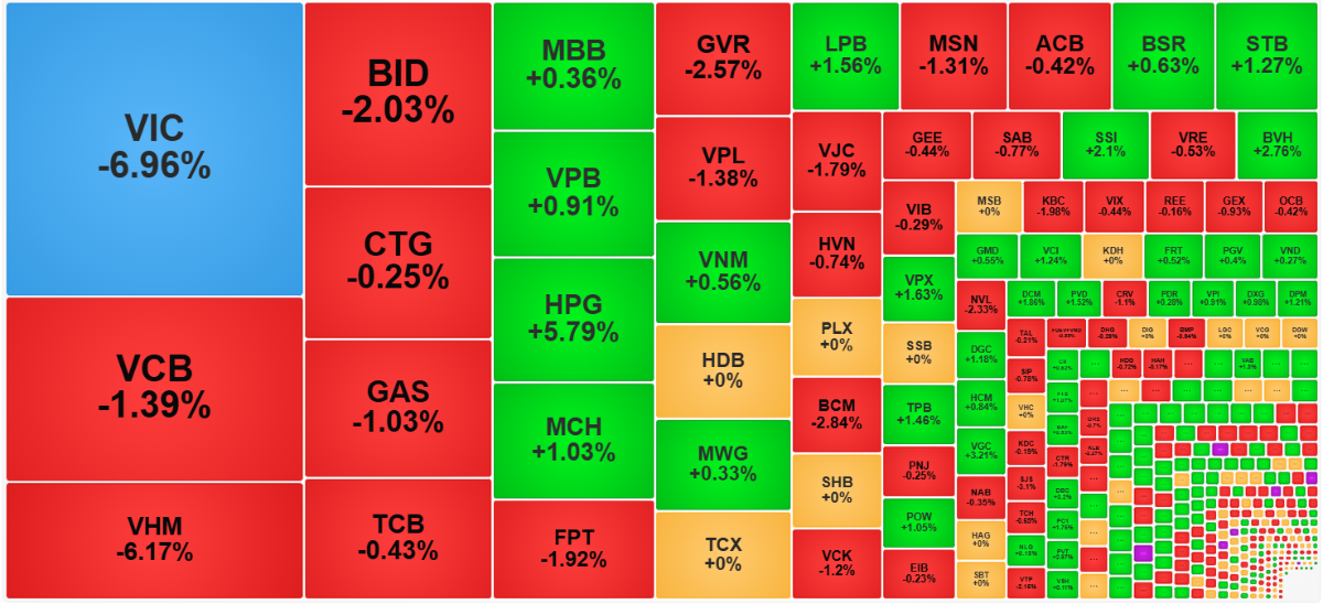 Không khó để nhận ra “thủ phạm” chính khiến VN-Index lao dốc hôm nay chính là cổ phiếu VIC của Tập đoàn Vingroup. Việc VIC giảm sàn đã tạo áp lực tâm lý lớn lên toàn thị trường. Bên cạnh VIC, các cổ phiếu vốn hóa lớn khác như VHM, VCB, BID cũng đồng loạt giảm sâu, “góp phần” vào đà giảm của chỉ số. Có thể nói, chỉ 4 cổ phiếu này đã “lấy đi” tới 22,5 điểm, thậm chí còn nhiều hơn tổng số điểm mà VN-Index mất.