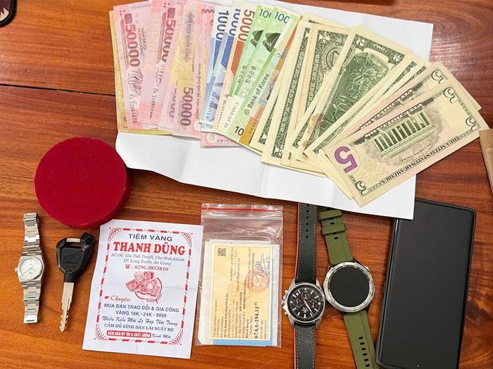 Qua khám xét phương tiện và nơi ở của Lê Bình Yên, Công an phường Long Xuyên đã thu giữ nhiều tang vật quan trọng, bao gồm một số ngoại tệ, một sợi dây chuyền và 9 chiếc nhẫn bằng kim loại màu vàng, cùng nhiều đồ vật có liên quan đến vụ án.